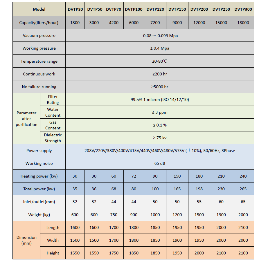 - DVTP Double Stages High Vacuum Transformer Oil Purification Machine is designed for purification of insulating liquids in the oil-filled electrical equipment, it can be used to degas, dehydrate, filtering and restores dielectric strength of insulating oils, Through the dehydrator, degasification, filtration processes, the dissolved gases and moisture, solid particulate, contamination can be completely removed. The purification range includes all insulating oils filled in transformers, circuit breakers, capacitor, cable, mutual inductor, above 110KV EHV transmission and distribution equipment, and more than 500KV UHV transformer insulating oil etc.