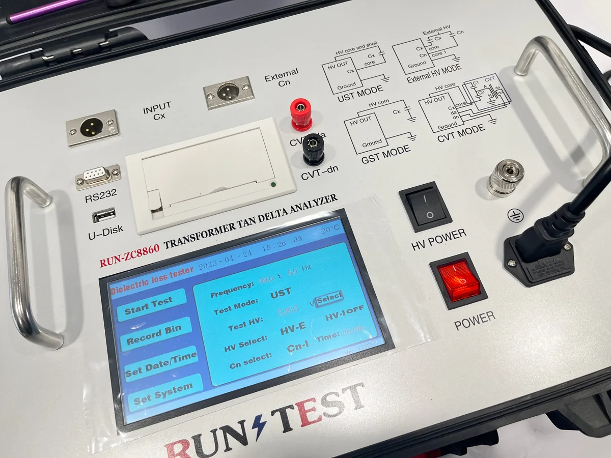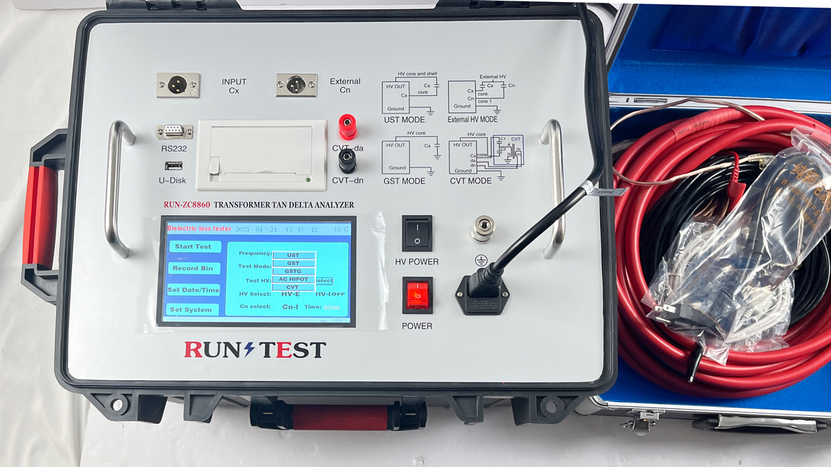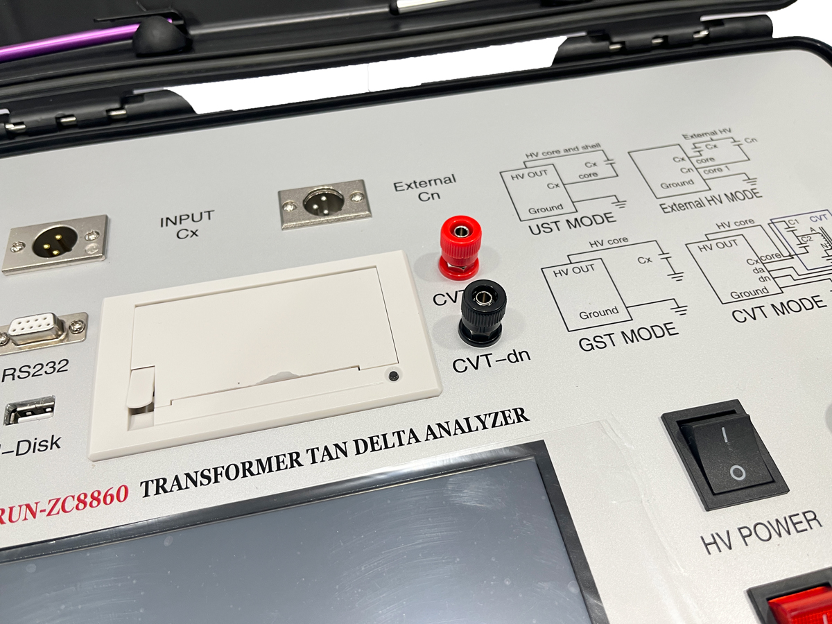 RUN-ZC8860 Transformer capacitance and tan delta tester is used for on-site anti-interference dielectric loss measurement, or precision dielectric loss measurement in the laboratory. The instrument is an integrated structure with built-in dielectric loss bridge, variable frequency power supply, test transformer and standard capacitors. Using frequency conversion anti-interference and Fourier transform digital filtering technology, automatic and intelligent measurement, the measurement data is very stable under strong interference. Besides functions listed above, Run-ZC8860 also has the function of insulation resistance measurement. The wiring method for measuring the insulation resistance is exactly the same as that of the dielectric loss measurement. The dielectric loss and the insulation resistance can be measured in one connection which significant improve test speed and reduce burden of test.